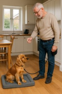 Start with a bed or mat that is easy to identify. Bring your dog to the bed, reward them for stepping onto it, and then reward them for staying there. Early on, you’re paying for tiny wins. You’re building value. You’re teaching the dog that the bed is a great idea.