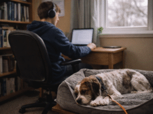 One common sign is a dog who follows you around but doesn’t really engage. They might trail behind you, sit when you stop, and lie down a lot, but their body looks a bit tight or their face looks “blank”. Another sign is a dog who doesn’t explore. They stay in one spot, pick one safe corner, or move only when they have to.