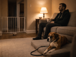 Set up one main safe area. Keep the layout simple. Use baby gates, a crate if your dog is crate-comfortable, or a defined rest spot so your dog doesn’t feel they have to patrol the whole house. Keep your energy calm and your expectations low.
