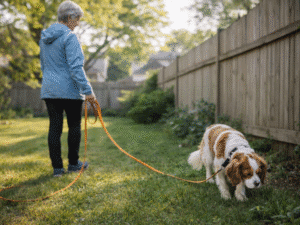 If your dog wants to engage, keep it short and easy. A tiny game. A scatter of kibble in the grass. A simple name response cue. Then stop while it’s still going well. In early dog training, we want “that was easy” to be the feeling that ends the session.