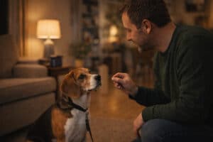 Start indoors. Quiet room. Minimal distractions. High-value reinforcement ready to go. Yes, food is usually your best option at first because it is fast and clear, and it lets you pay your dog the instant they make the right choice.